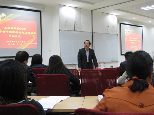 曹德明校长首先对培训班的顺利开班表示祝贺。他指出,青年骨干教师是学校教学和科研的主要力量,是实现未来战略性发展的关键人才,学校对青年教师的素质提升高度重视。同时,为配合教育部积极筹划实施提升哲学、社会科学领域专家的国际交流能力,人事处会同相关专家精心制定培训方案,引入美国哈佛大学非英语母语国家全新成人英语培训流程,聘请我校资深英语专家、学者授课,因此,首期中青年骨干教师英语能力培训班是我校目前为止规模较小、层次最高的培训班,是学校精心打造、筹备时间最短的培训班,是全面贯彻学校党委实施国际化发展战略,切实加强我校教师队伍建设,提升我校教师的专业水平和业务能力的一项重要举措。