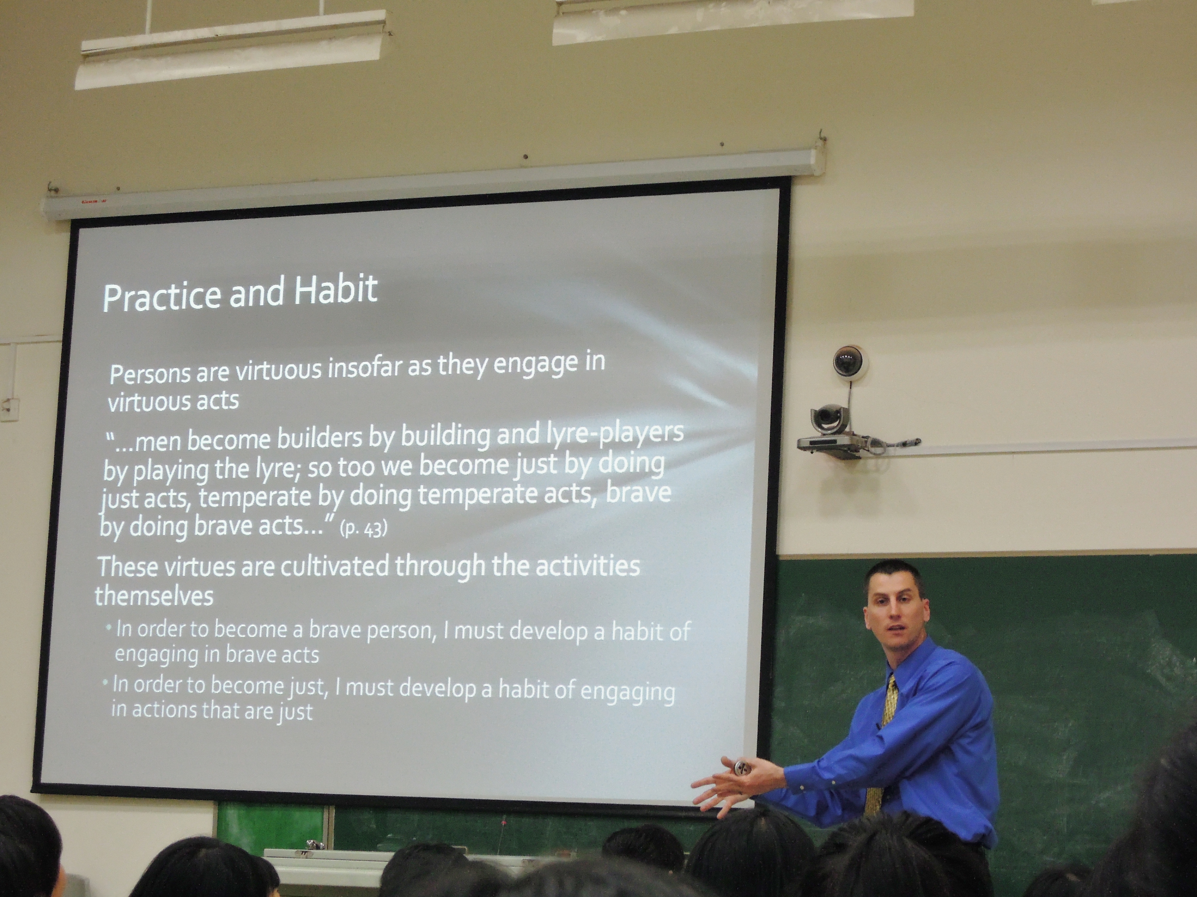 教授又从“Discipline of Ethics”出发,引出道德规范对人处于社会中的指导意义,那人在社会中活着的主要目标是什么?亚里士多德称之:幸福。那获得幸福的途径又是什么?“Intellectual Contemplation”。故言:哲学家是最幸福的。你是否同意亚里士多德的观点呢?其次,亚里士多德的教育目标是美德的培养,包括理性灵魂意义上智慧的美德以及不在此意义上的道德品质方面的美德。而在培养Ethics的途径上, Stoltz教授又通过佛教,孔子的儒家思想与Aristotle进行了对比,显示出各家对优秀之“人”培养的不同奥妙,也给同学一种对比思考学习中西方哲学的方法。“海外名家系列讲座”着实给同学们带来一场场思想的盛宴,我们也期待更多精彩的思维冲击。