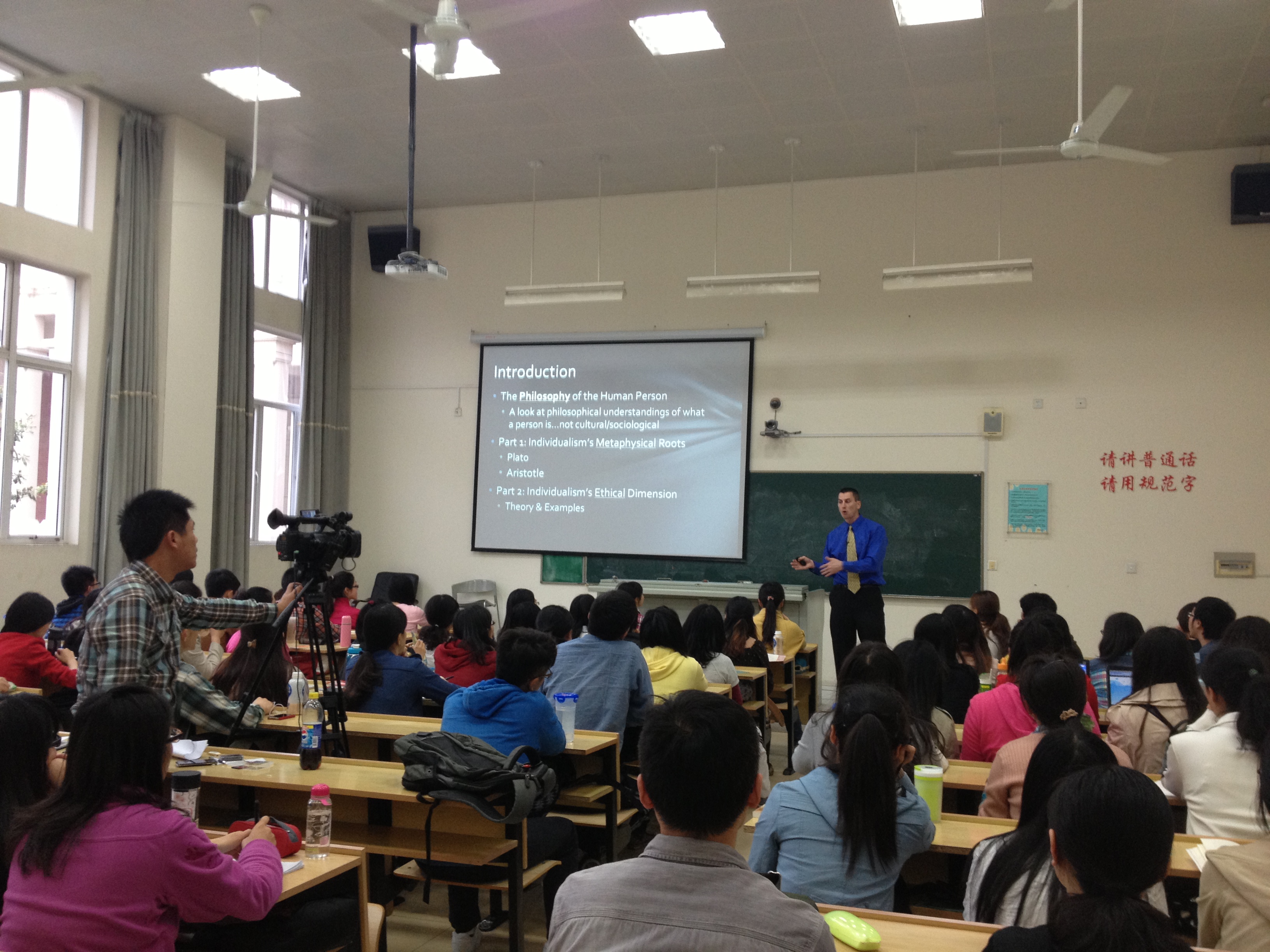 Stoltz教授先以“计划生育,独生子女”政策为例,从美国批评主义和国人的不同观点入手,揭开了本次讲座的序幕。主要生动地阐述了柏拉图与亚里士多德在世界观以及灵魂说的不同主张。柏拉图更强调抽象的理念世界而Aristotle则更关注于物质的现实世界;柏拉图认为灵魂不灭,身体与魂灵是分别孤立的,而亚里士多德认为灵魂是潜在地具有生命的自然形体的形式,一旦身体死亡,灵魂也就灭亡。灵魂也决定了一个人的形式。然后他又从Metaphysics of Persons与Biology of Persons的比较中引出了亚里士多德理论中存在的可能性问题。是否仅仅以“form and function"定义“人”就足够了吗?答案显然是差矣。那到底“What is a person”?这也引起了同学在哲学意义上对人的深入思考。