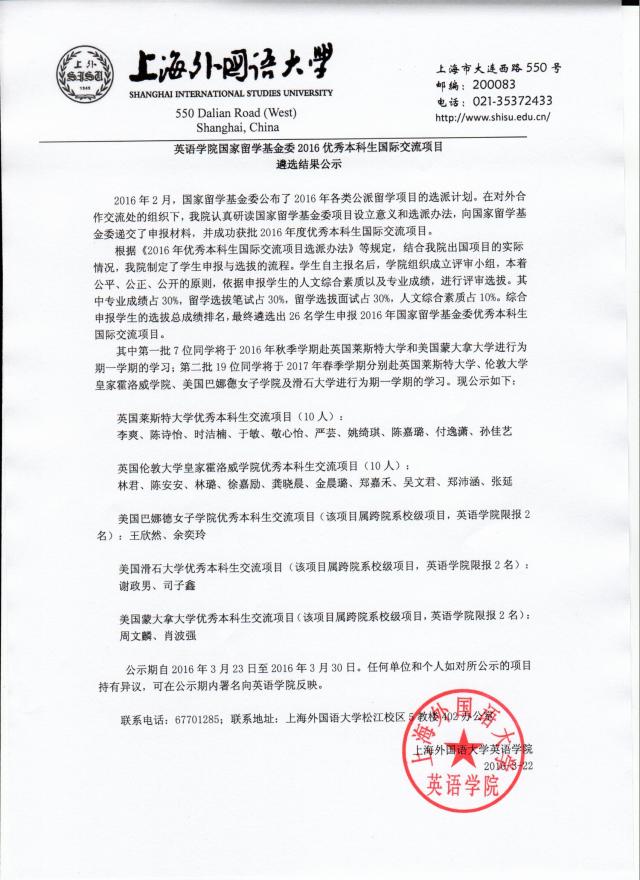 2016年2月,威尼斯欢乐娱人城1099成功获批2016年度优秀本科生国际交流项目。根据《2016年优秀本科生国际交流项目选派办法》等规定,结合出国项目的实际情况,我院制定了学生申报与选拔的流程。学生自主报名后,学院组织成立评审小组,本着公平、公正、公开的原则,依据申报学生的人文综合素质以及专业成绩,进行评审选拔。其中专业成绩占30%,留学选拔笔试占30%,留学选拔面试占30%,人文综合素质占10%。综合申报学生的选拔总成绩排名,最终遴选出26名学生申报2016年国家留学基金委优秀本科生国际交流项目。现公示如下: