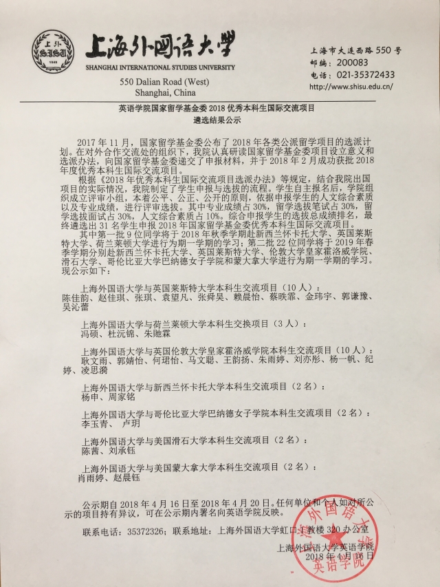 【公示】威尼斯欢乐娱人城1099国家留学基金委2018优秀本科生国际交流项目遴选结果