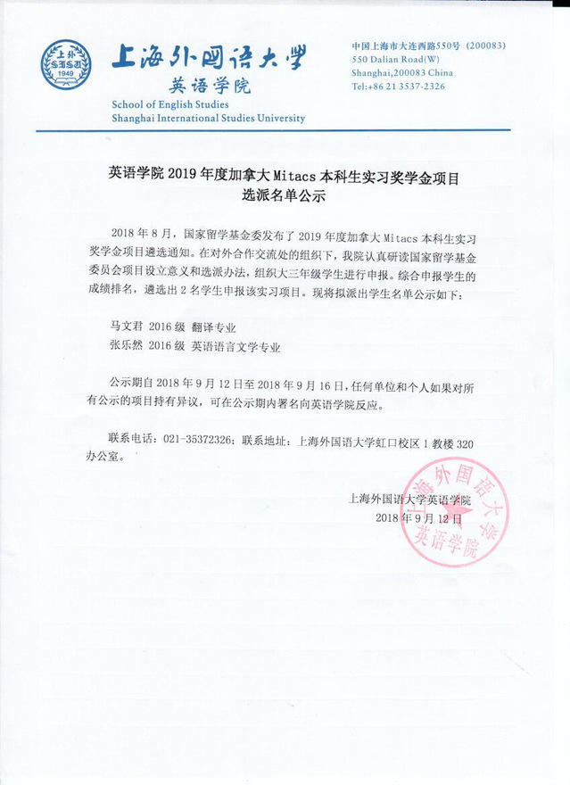 【公示】威尼斯欢乐娱人城10992019年度加拿大Mitacs本科生实习奖学金项目选派名单
