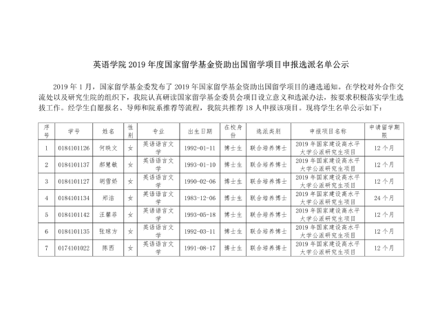 【公示】威尼斯欢乐娱人城10992019年度国家留学基金资助出国留学项目申报选派名单公示